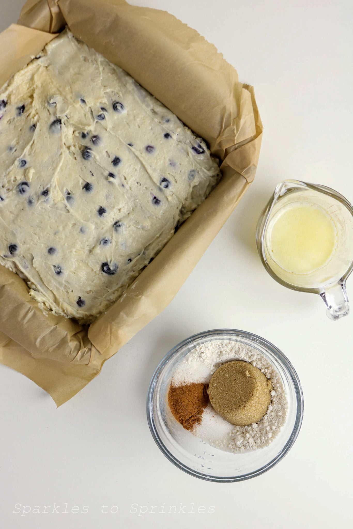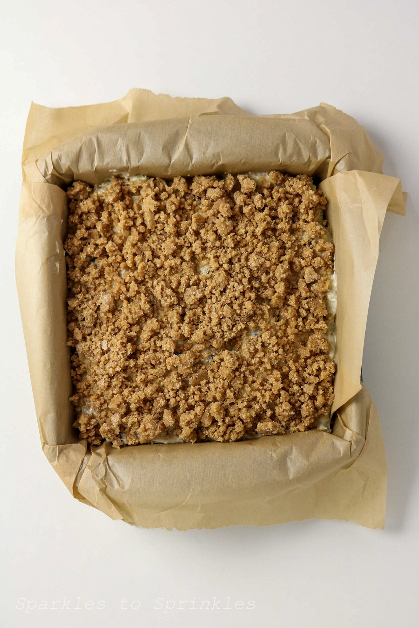 - In a small bowl, mix the flour, brown sugar, granulated sugar, and cinnamon. Pour in the melted butter and stir until crumbly. Sprinkle evenly over the batter.