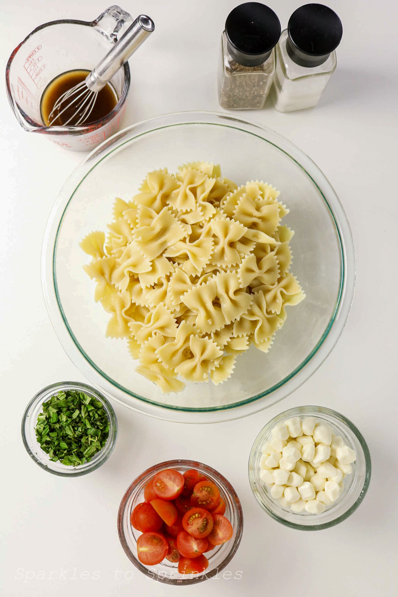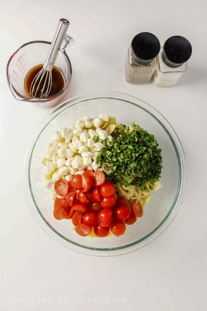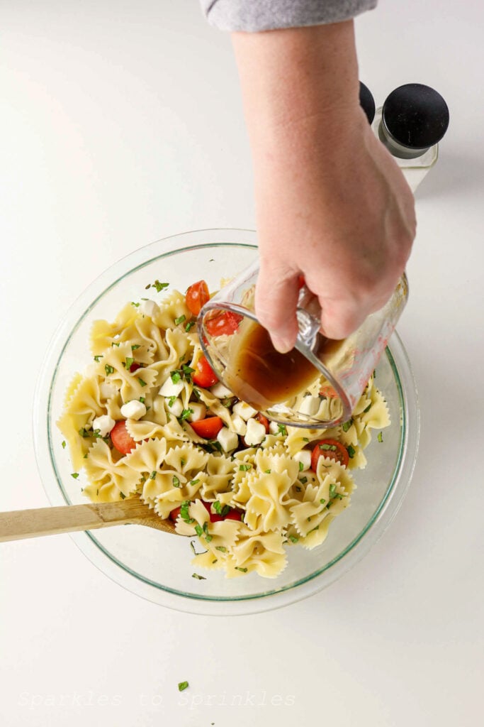 - In a small bowl, whisk together the olive oil, balsamic vinegar, garlic, salt, and pepper. Pour the dressing over the pasta mixture and toss until evenly coated.