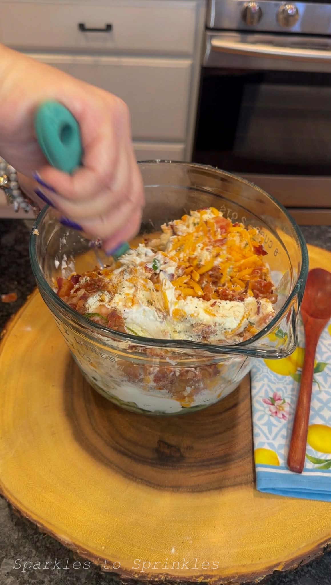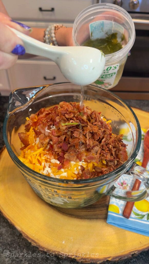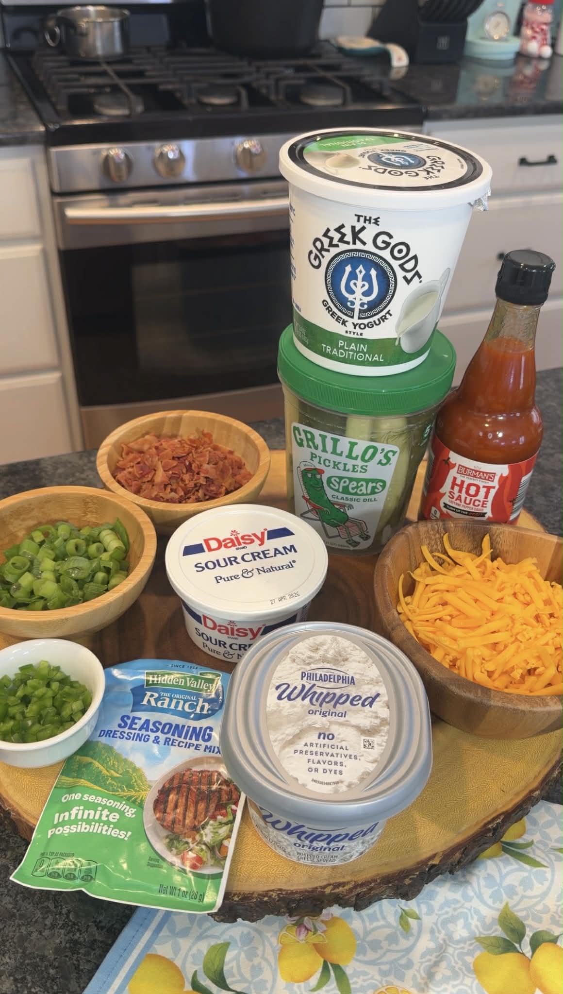 - Add chopped pickles to a bowl, add in diced jalapeno, add in chopped green onions, Greek Yogurt, Whipped Cream Cheese, Sour Cream, Shredded Cheese, Ranch Seasoning, Hot Sauce to taste, Chopped Bacon pieces, & 1-2 TBSP of the reserved pickle juice. *(Once you are happy with the taste, you can dispose of the pickle juice or save in a different container if you will be using your Grillo container to serve your dip.)