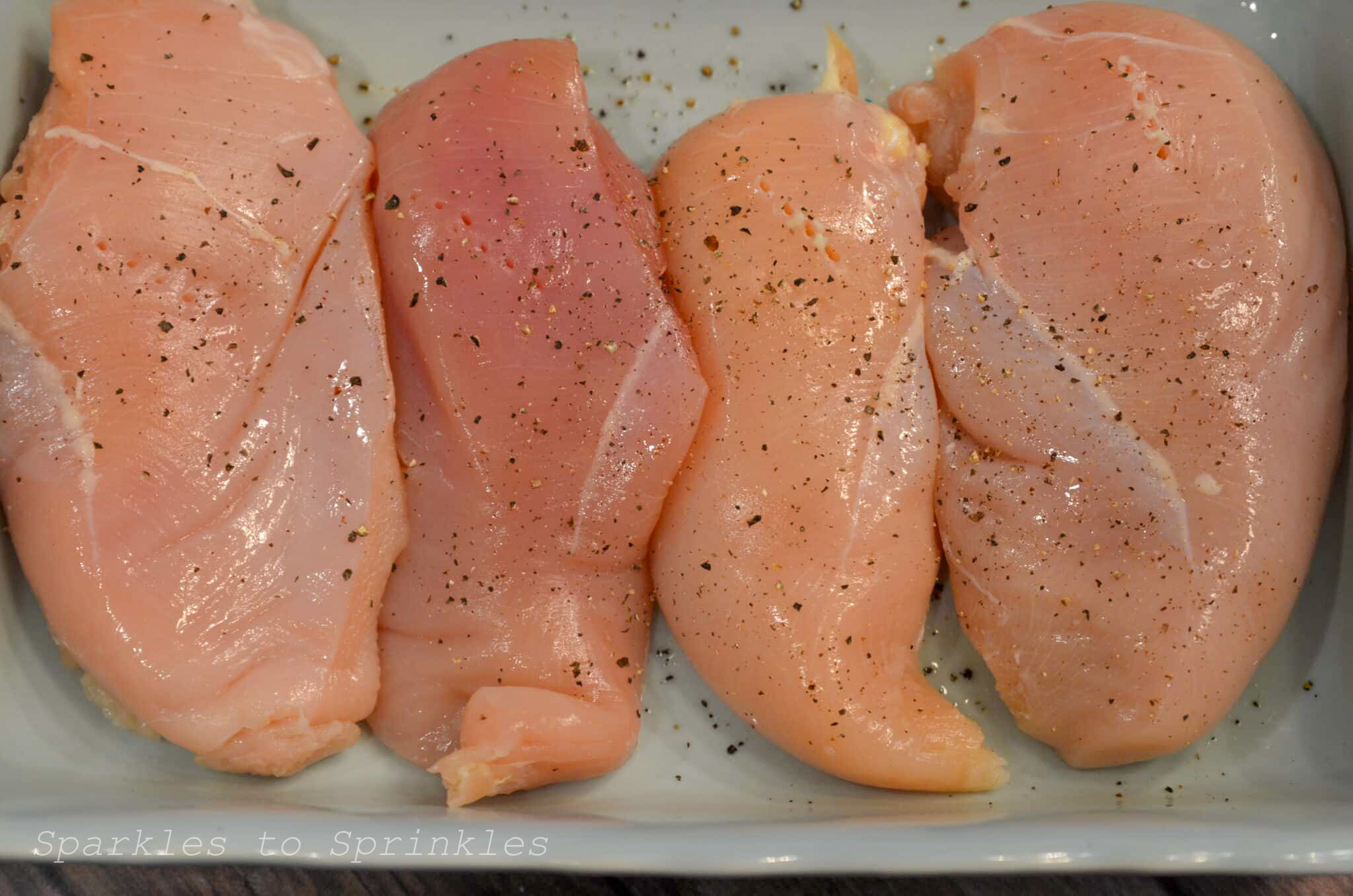 - Lay your chicken breasts into the baking dish. Season with pepper.