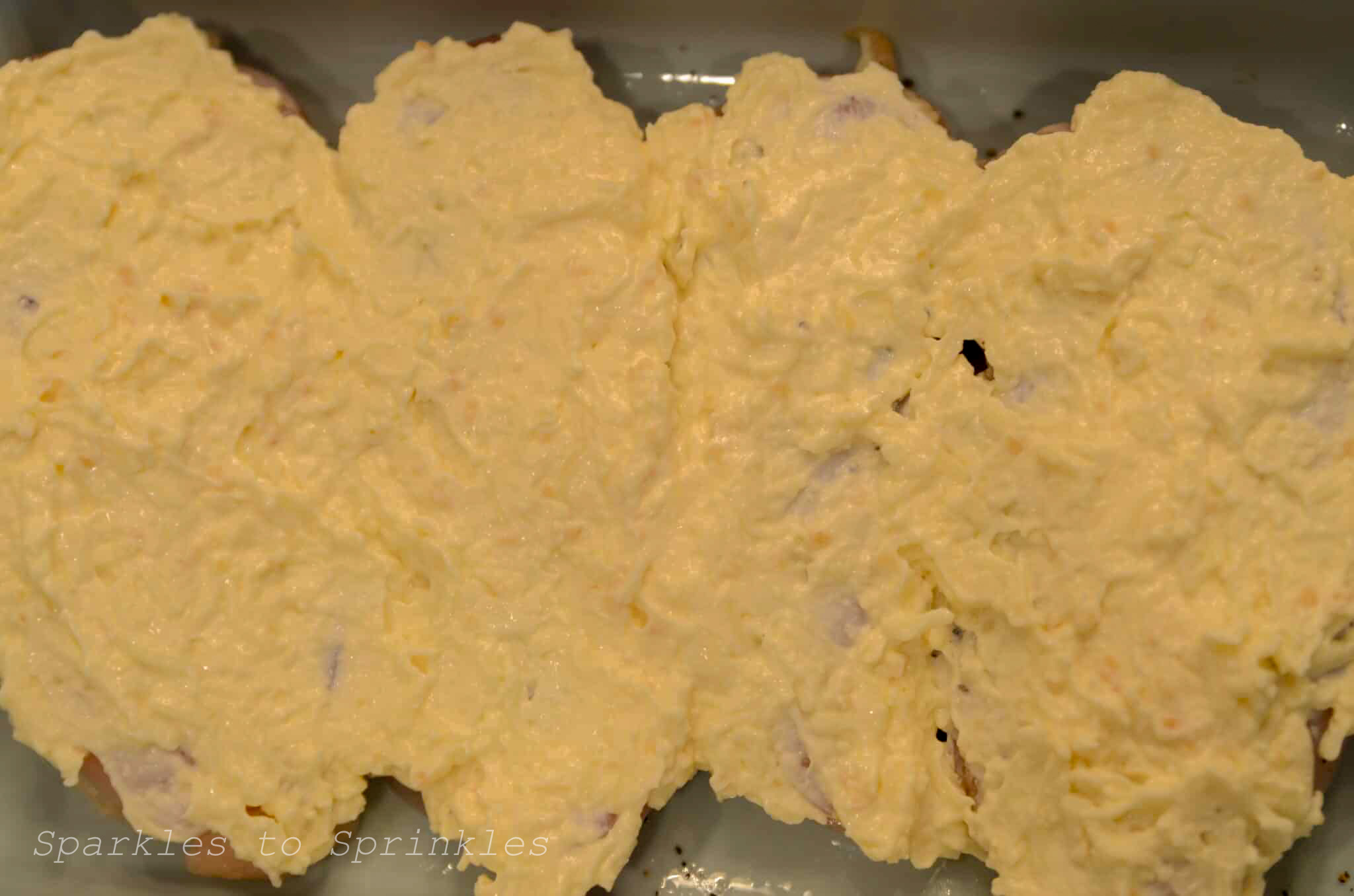 - Spread your cheese mixture over the top of your chicken breasts, completely covering them.