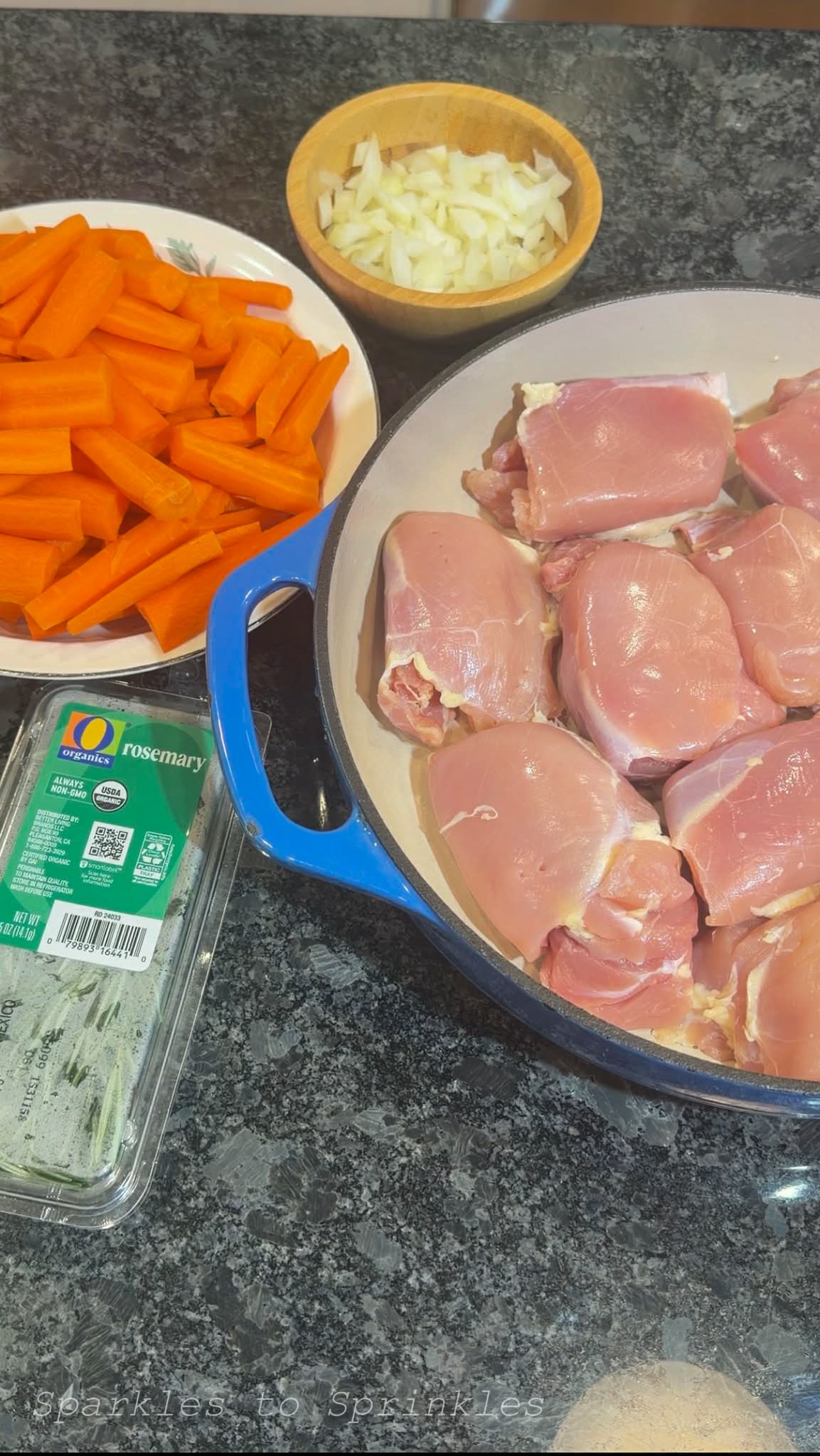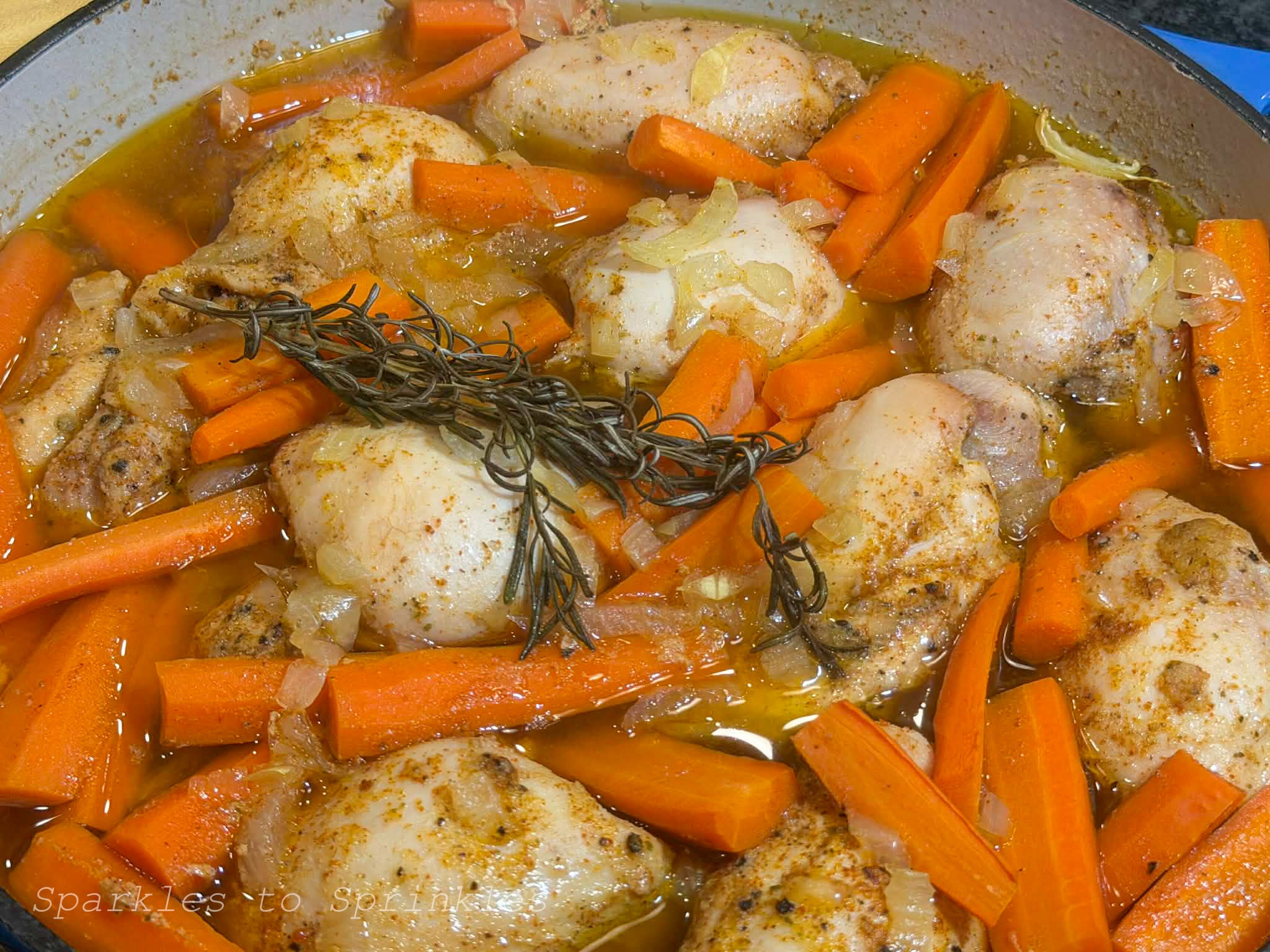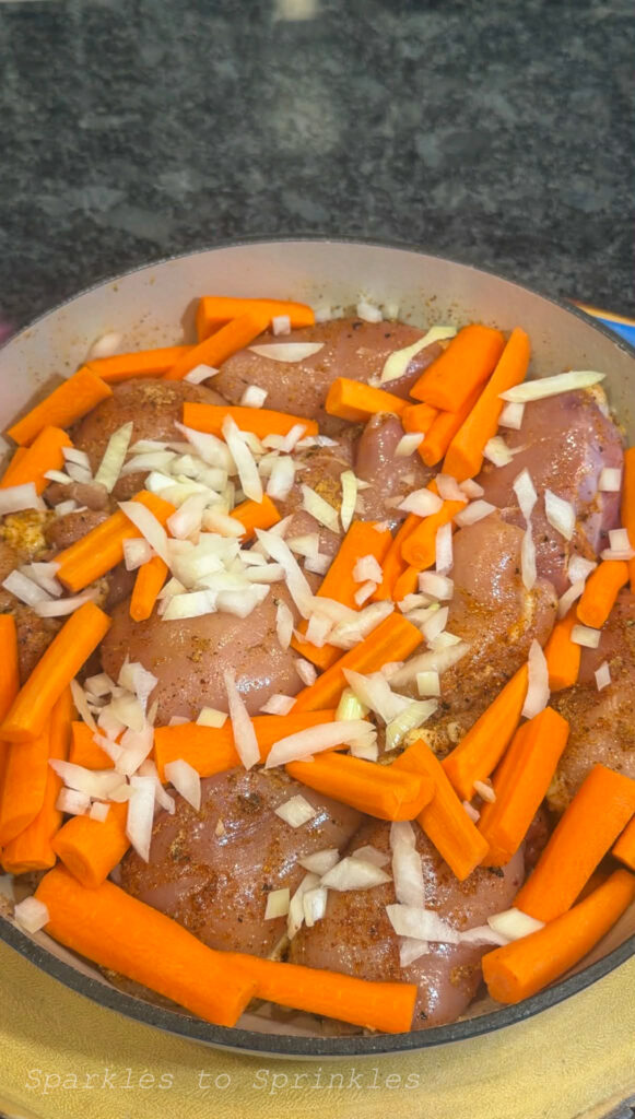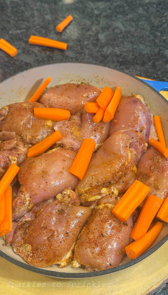 - Tuck carrots in between your chicken thighs, fit in as many as you can, they will cook even if not perfectly tucked in.