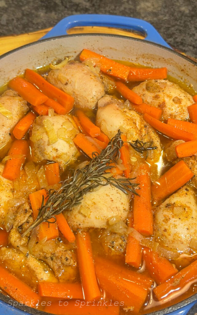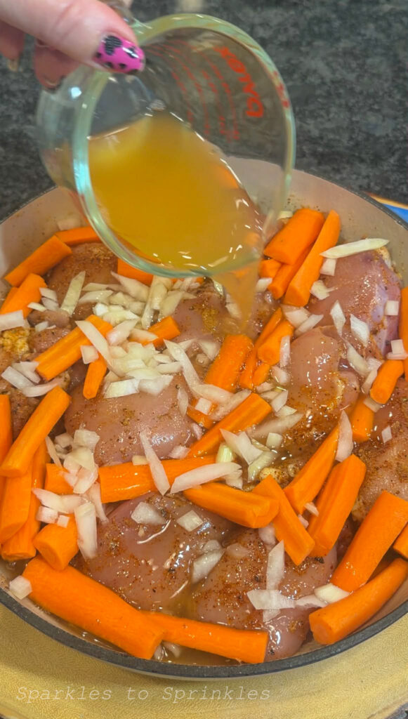 - Fit as many carrots as you can between the chicken pieces. They cook perfectly in the broth and soak up all of that flavor.