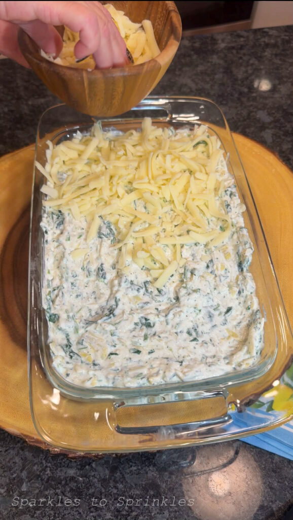Mix spinach, artichokes, minced garlic, Alfredo sauce, cream cheese, shredded mozzarella (save enough to sprinkle over the top), & parmesan cheese. Mix well.