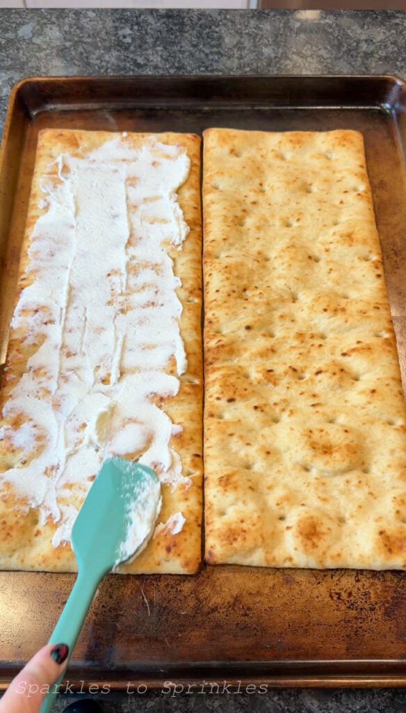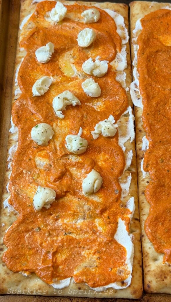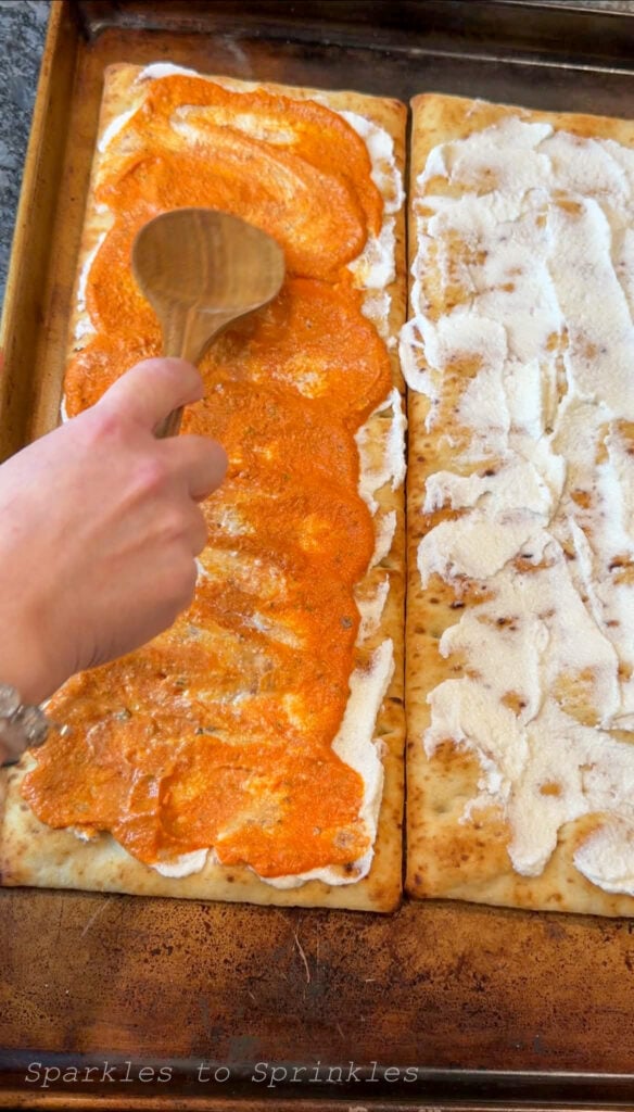 Place both pizza crusts on a baking sheet. Spread the garlic spread dip evenly over each crust. I used the full container divided between the two crusts.