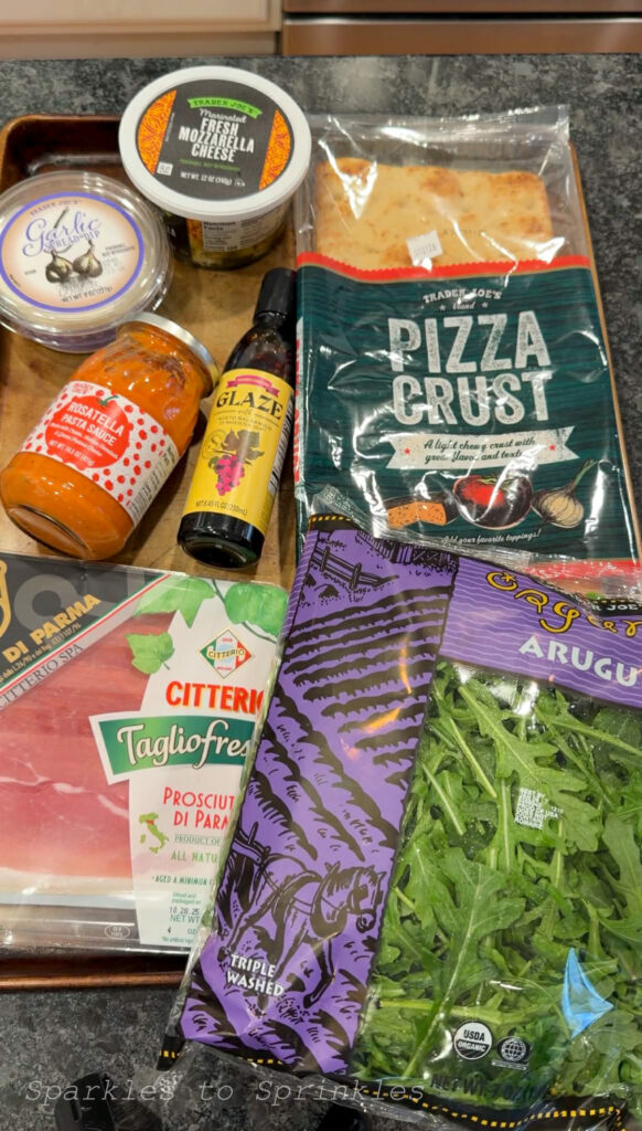 Trader Joe’s Viral Pizza has taken over social media and for good reason. It is simple, indulgent, and made entirely with Trader Joe’s favorites that work together beautifully. The garlic spread creates an incredible base, the pasta sauce adds richness, and the marinated mozzarella melts into the most flavorful bites. Finished with prosciutto, fresh arugula, and balsamic glaze, this pizza feels elevated but still incredibly easy to make at home.