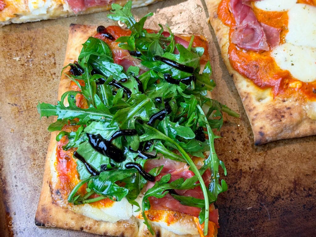 - Add the arugula after baking so it stays fresh and vibrant