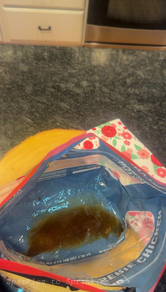 Remove the chicken from the bag. Make sure you leave the juice behind in the bag.